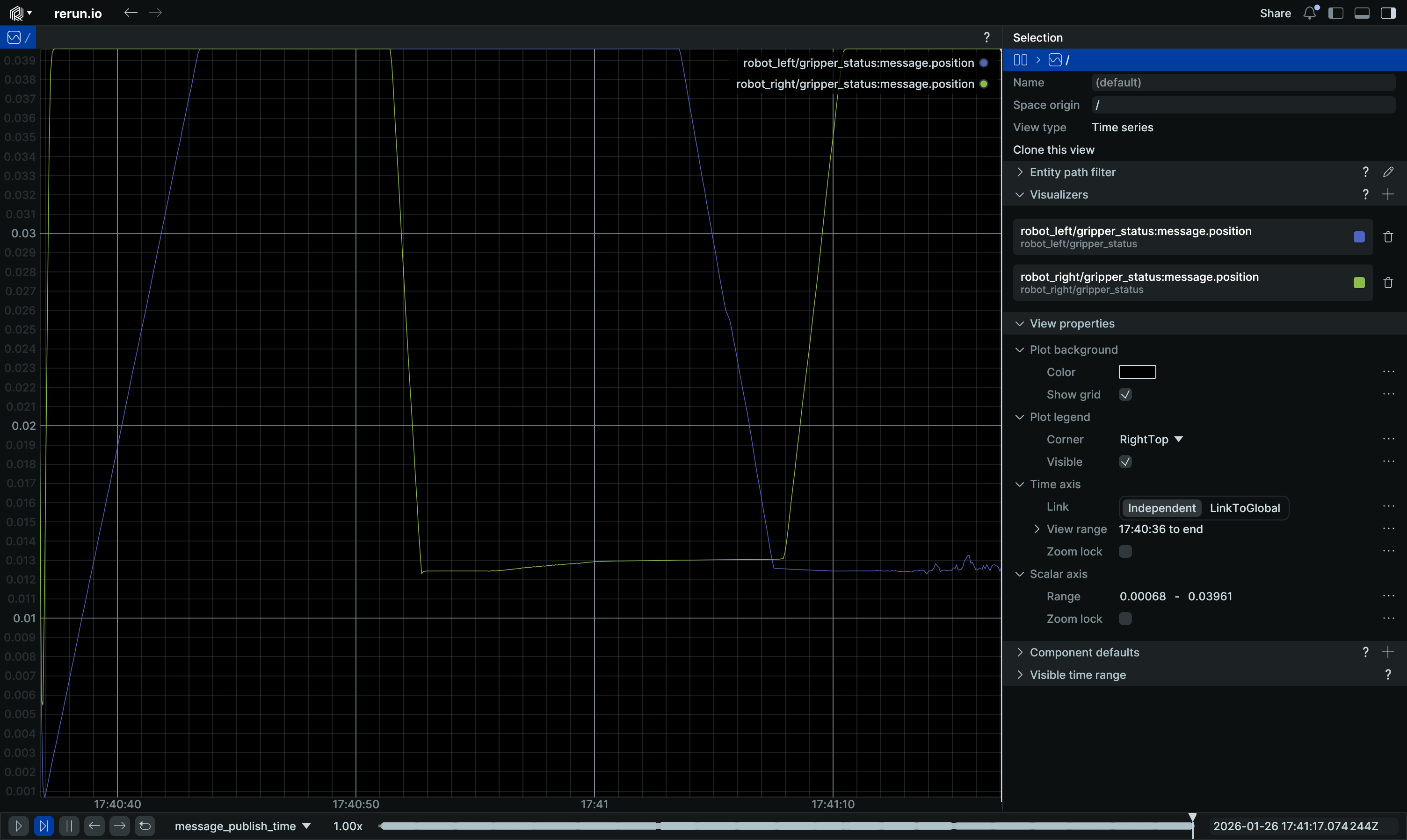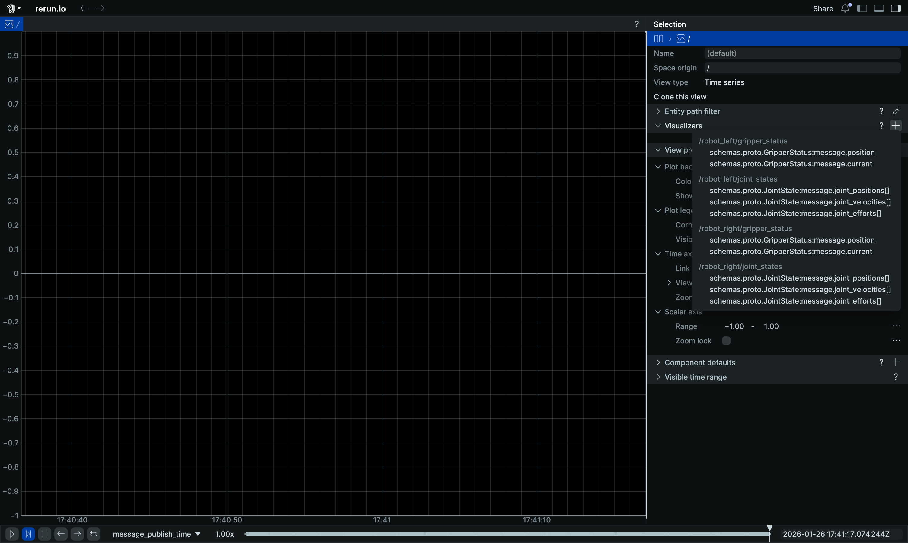 Here's an example with a custom Protobuf message that contains a robot gripper state. After adding a new timeseries view via the blueprint panel, we select the Protobuf fields from our MCAP that we want to view through the view's selection panel: